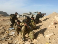 바그다드의 안바르 지역 도시 라마디의 동쪽 교외에서 지하디스트들과 충돌이 일어나는 동안 이라크 군이 각자의 위치를 잡고 있다.