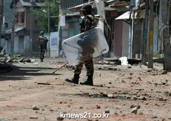 인도령 카슈미르 지역에서 16일(현지시간) 군이 시위대에 발포해 사상자가 발생하면서 긴장이 고조되고 있는 있는 가운데 다음날은 17일 인도 군인들이 카슈미르 지역을 감시하고 있다.