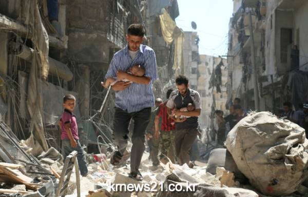 시리아 알레포의 반군 지역인 살리힌 마을에 정부군의 공습 보고 후 어린 아기들을 안고 부서진 건물들 사이를 뛰어가고 있는 시리아 사람들.