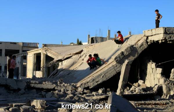 시리아 남서부 다라(Daraa) 반군 지역 도시의 파괴된 건물 잔해를 타고 노는 아이들.