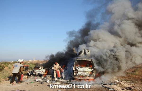 '화이트 헬멧'으로 알려진 시리아 민방위가 시리아 마을에서 도망치려는 사람들의 차량에서 화재가 발생하자 생존자를 찾고있다.