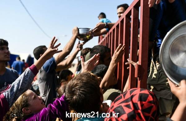 이라크 모술 남부지역 카라야(Qayyarah)에서 식량을 배급받기 위해 손을 뻗는 사람들.