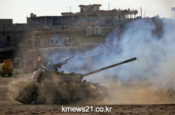 이라크 정부군이 모술 북서쪽에서 약 15Km 떨어진 바수시 마을에서 전투중인 모습