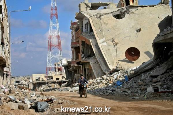 한 시리아 남성이 남부도시 다라에서 파괴된 건물 사이를 오토바이를 타고 지나가고 있다.