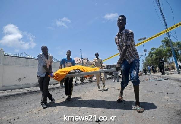 소말리아 수도 모가디슈에서 5일(현지시간) 식당 타깃 차량 자살폭탄 공격으로 6명이 사망했다. 사진은 테러 공격으로 인한 희생자를 옮기고 있는 모습.