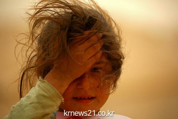 시리아-터키 국경인 알 마부루카(al-Mabrouka)의 한 난민캠프에서 시리아 여자 아이가 바람에 눈을 가리고 있다.