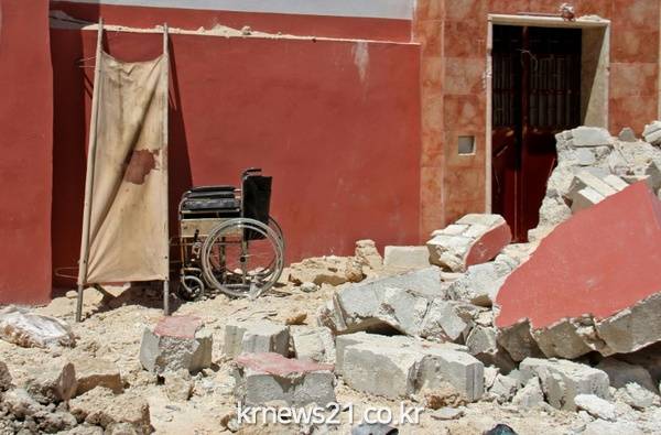 시리아 반군지역에 공습이 지나간 후 무너진 건물 잔해들 사이에 휠체어가 서 있다. 터키군은 25일(현지시간) 터키 남쪽의 이라크 북부 및 시리아 북동부에 소재한 쿠르드족 반군 지지를 공습했다고 밝혔다. 터키군은 쿠르드 반군 세력들이 요원들과 무기를 터키로 몰래 들여오는 것을 막기 위한 조치라고 설명했다.