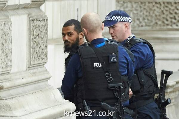 27일(현지시간) 영국 런던 의사당 인근에서 칼을 들고 배회하던 남성에 대테러 경찰에 체포됐다.