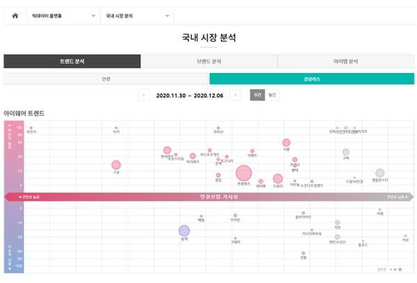 국내 시장 분석은 △아이웨어 트렌드 주요 키워드 분석, 채널별 정보량을 확인할 수 있는 ‘트렌드 분석’ △빅데이터로 선정한 상위 100개 브랜드에 대한 이슈, 관심도, 감성 분석 정보를 확인할 수 있는 ‘브랜드 분석’ △아이웨어 제품의 소비자 구매 요인, 소재별 소비자 관심도를 알 수 있는 ‘아이템 분석’으로 주요 메뉴가 구성되어 있다.