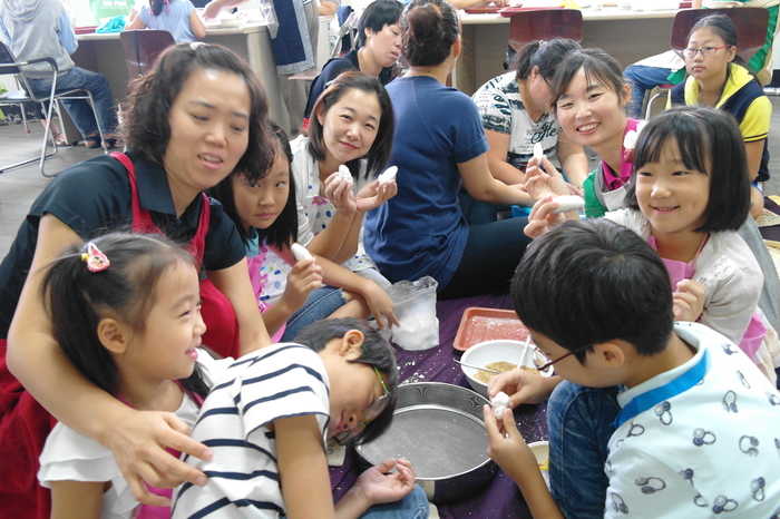 깨, 밤, 고물로 속을 채우고 흑임자, 쑥, 호박, 흰쌀로 영양과 맛 모양을 두루 갖춘 먹음직스러운 송편이 엄마, 아빠, 아이들의 정성을 통해 다양한 모양의 개성 넘치는 송편으로 완성되었다.
