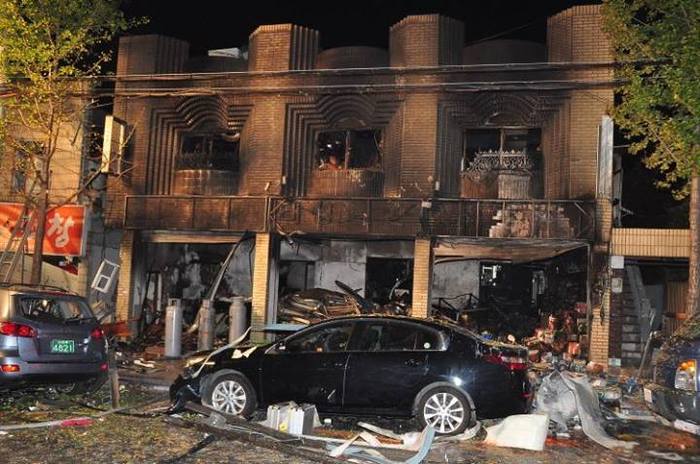 사고는 자정에 가까운 시간 일어났으며 폭발로 인해 상가건물이 불길에 휩싸이고 근처 주차되어있던 차량들이 모두 폭탄에 맞은 것처럼 주저앉았다.