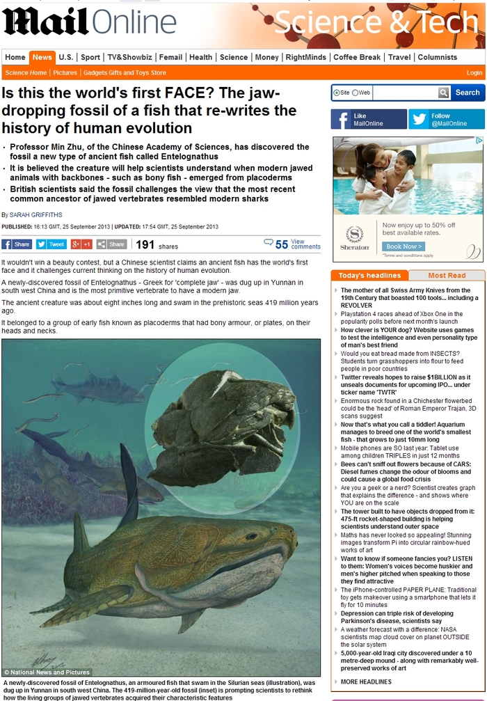 분석 결과, 이 어류 화석은 약 4억 1900만 년 전 존재했던 어류 ‘엔테로그나투스(Entelognathus)’로 밝혀졌다.