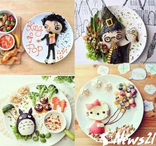 사진엔 김, 야채 등 식재료로 '해리포터', '이웃집 토토로', '헬로키티' 등 아이들이 좋아하는 캐릭터 뿐 아니라 전설이 된 가수 마이클 잭슨의 캐릭터까지 완벽하게 재현된 밥상 사진이 담겨 있다.