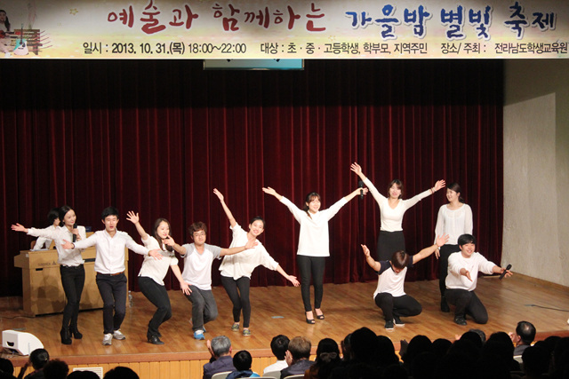 ▢ 전라남도학생교육원(원장 김춘환)은 시월의 마지막 날인 10월 31일에 해남, 강진지역 초·중·고등학생, 교사, 학부모, 지역주민 230여명을 대상으로 ‘예술과 함께하는 가을밤 별빛 축제’를 개최하여 큰 호응을 얻었다.