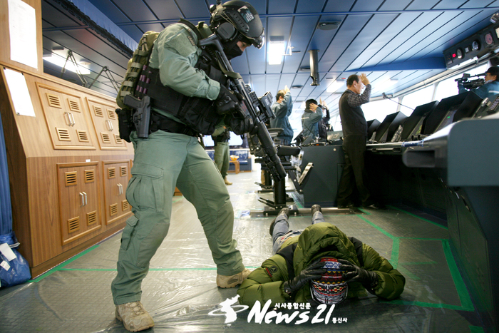 현대삼호중공업의 협조로 불무기도 앞 해상에서 실시된 이번 훈련은 항해중인 선박이 무장 테러범에 장악당한 상황을 가정해 공중과 해상에서 동시 진입, 테러범을 진압하는 내용으로 실시됐다.