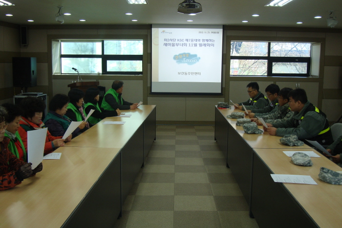 새마을부녀회는 이날 미8군지원단 제7중대 고한식 본부장외 10명의 대원들과 함께 월례회의를 통해 앞으로 보산동 지역의 어려운 이웃을 돕기위한 사랑의 집수리사업, 연탄배달, 휴경지경작 등 새마을 사업의 발전방향을 함께 논의했다.