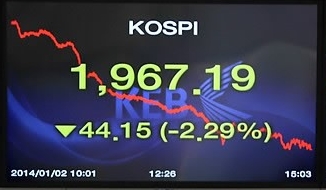 한국거래소에 따르면 2일, 코스피는 전 거래일보다 44.15포인트 하락한 1967.19로 장을 마감했다. 코스닥은 3.71포인트 하락하며 2012년 7월 이후 1년 6개월 만에 가장 큰 폭으로 떨어졌다.
