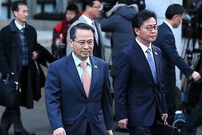 ▲판문점으로 출발중인 우리측 대표단(중앙에 김규현 청와대 국가안보실 1차장)