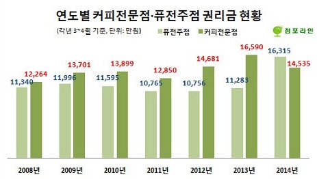 점포라인에 따르면 매년 3~4월은 1년 중에서도 점포거래가 가장 활발히 이뤄지는 ‘성수기’ 시즌으로 이 기간 커피전문점 권리금이 전년동기대비 2000만원 이상 떨어진 것은 통계 산출을 시작한 2008년 이후 처음이다. 국제 금융위기 이후 경기침체가 극에 달했던 2011년에도 커피전문점 권리금은 1000만원 가량 떨어지는 데 그친 바 있다.