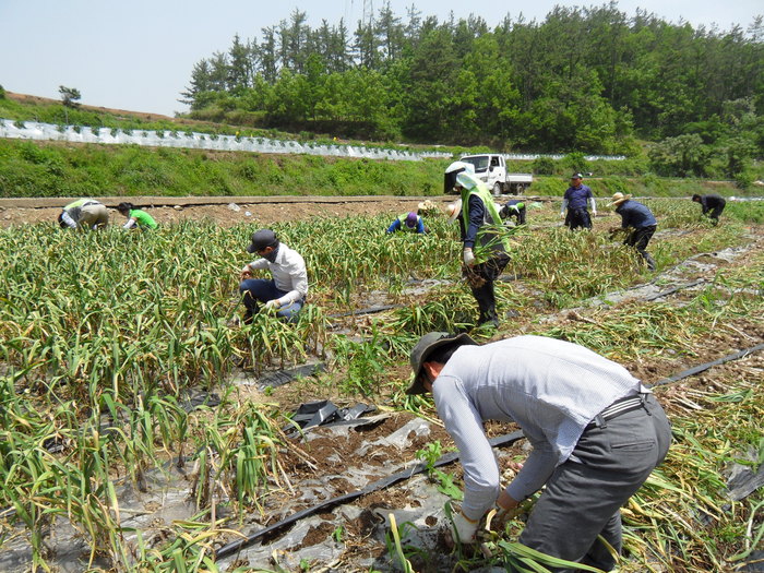 해남지사(지사장 최오남)는 2014년 5월 27일(화) 농촌일손돕기 사회공헌활동의 일환으로 농어촌 일손돕기 봉사활동으로 마늘 양파수확등 밭농사 중심의 농촌 노동인력이 부족한 해남군 삼산면 원진리 김봉연(75세)님 600여평의 밭에서 마늘뽑기를 실시하였다.