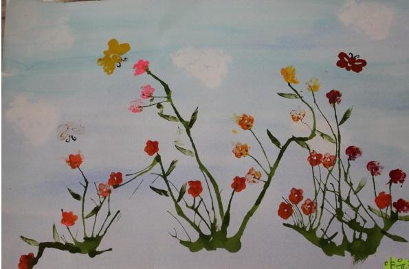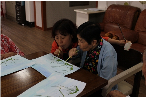 이날 회원들은 어르신들과 함께 물감을 도화지에 뚝뚝 떨어 뜨린후 빨대를 이용해 불어보는 과정을 통해 물감이 자연스럽게 번지면서 모양이 나오게 하고, 빨대 그림 위에 다시 색칠을 하거나, 무우를 이용해 만든 꽃도장을 찍어내는 등 아름다운 꽃밭 그리기를 완성하였다.