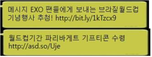 이번 스미싱 문자에는 ‘메시지 EXO 팬들에게 보내는 브라질월드컵 기념행사 추첨!’, ‘월드컵기간 파리바게트 기프티콘 수령’이라는 문구가 적혀있으며 해당 메시지에 인터넷주소를 포함하고 있다.