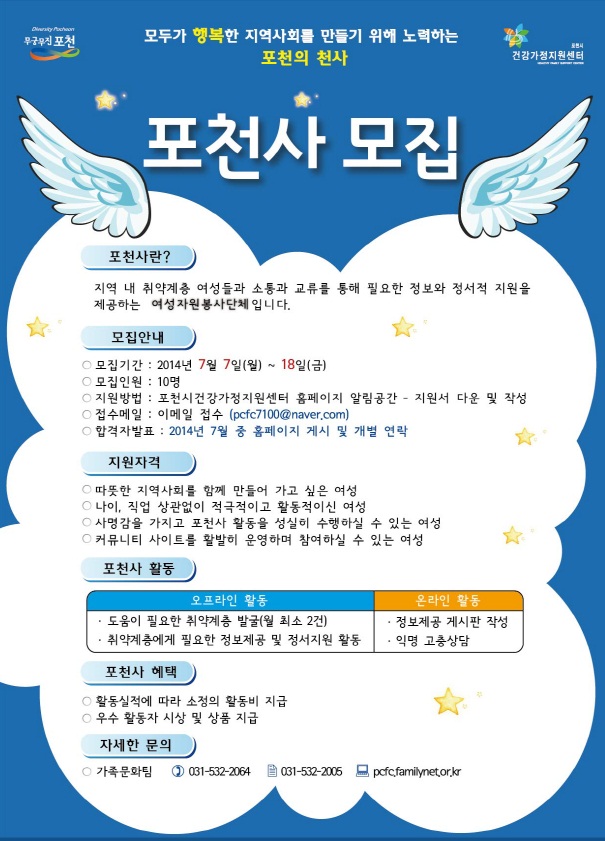 포천시(시장 서장원)는 포천시건강가정지원센터(센터장 문수경)와 함께 2014년 여성발전기금 지원사업인 포천사(포천의 천사) 서포터즈 사업 추진을 위해 자원봉사자를 모집한다고 8일 밝혔다.
