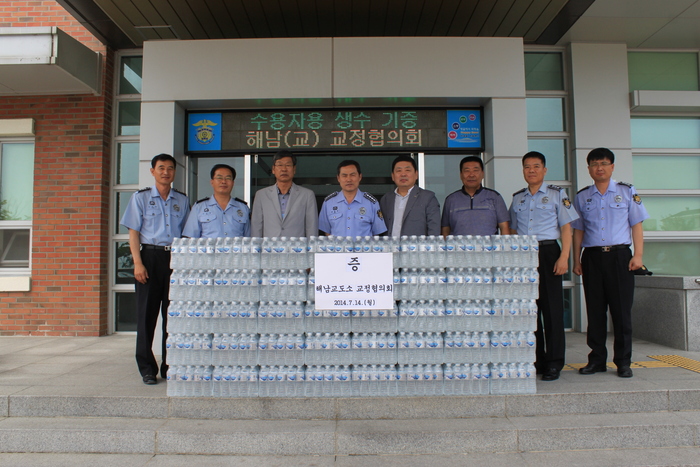 □ 2014년 7월 14일(월) 해남교도소 교정협의회(회장 최재철)는 혹서기를 맞아 무더위에 지친 수용자들이 건강한 여름을 보낼 수 있도록 생수 15,000병을 해남교도소(소장 김영준)에 전달하였다.