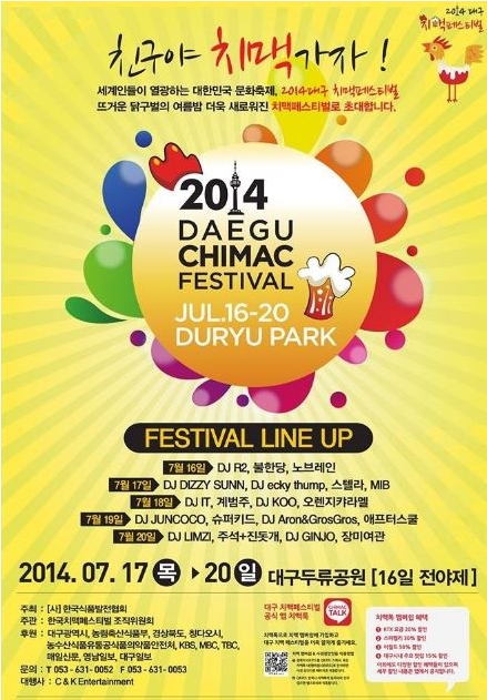 ‘치킨의 본고장’ 대구에서 개최되는 2014 대구 치맥페스티벌은 무료 입장부터 시식, 시음, 그리고 인기가수 공연 등 16일부터 20일까지 총 5일간 다채로운 이벤트가 진행되며, 호식이두마리, 땅땅, 별별, 종국이두마리 치킨, 오비맥주를 비롯해 80업체가 참여한다.