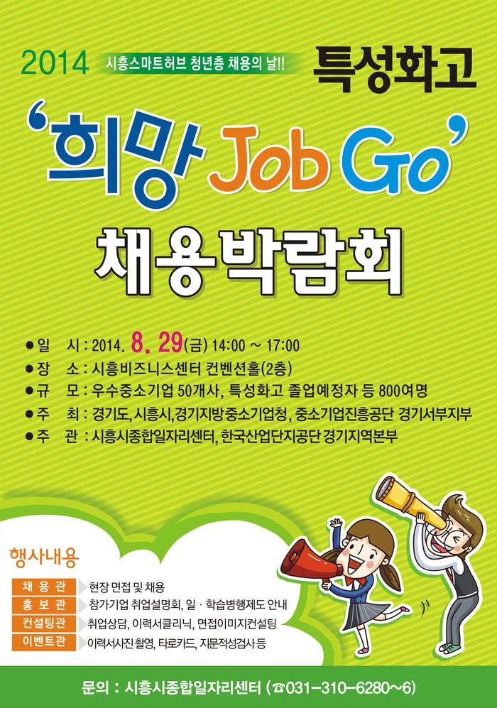 행 사 명 :『2014 시흥시 특성화고 희망Job-Go 채용박람회』 일 시 : 2014. 8. 29.(금) 14:00 ~ 17:00 장 소 : 시흥비즈니스센터 2층 컨벤션홀 (한국산업기술대학교 내) 행사규모 : 구인기업 50개사, 고교졸업예정자 등 800여명 행사내용 : 채용면접, 이력서클리닉, 지문적성검사, 이력서사진무료촬영 등 주 최 : 경기도, 시흥시, 경기지방중소기업청, 중소기업진흥공단 경기서부지부 주 관 : 시흥시종합일자리센터,한국산업단지공단 경기지역본부 문의사항 : 시흥시종합일자리센터 행사팀(☎031-310-6280~6) | ||