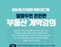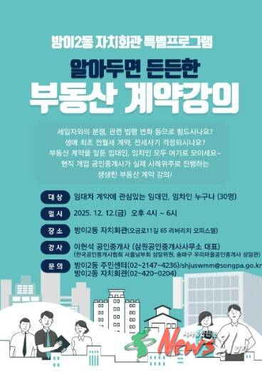 서울 송파구(구청장 서강석)는 방이2동 자치회관에서 오는 12월 12일 오후 4시부터 6시까지 '알아두면 든든한 부동산 임대차 계약 강의'를 개최한다. 이번 강의는 청년 1인 세대 전·출입이 잦은 방이2동 지역 특성을 반영해 마련했다. 2025년 11월 기준, 방이2동 1인 세대 중 20~39세는 6,412세대로 송파구 27개동 중에서 가장 많다. 방이2동 전체 1...