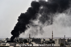 쿠르드에 의해 코반(Kobane)라고 알려진 시리아 Ain al-Arab마을에서 연기가 타오르고 있다.