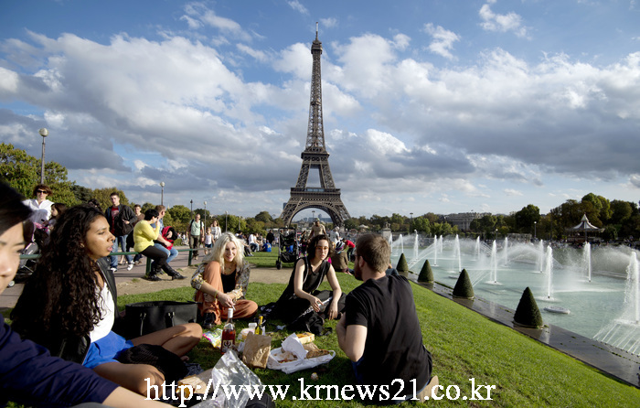 2014년 10월 19일, 파리 에펠탑 옆의 트로카데로 정원(Trocadero Gardens)에서 사람들이 일광욕과 피크닉을 즐기고 있다.