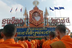 2014년 10월 28일, 캄보디아 프놈펜에 있는 로열 팰리스에서 승려들이 노로돔 시하모니(Norodom Sihamoni)국왕의 초상화 앞에서 기도하고 있다.