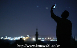2014년 10월 26일, 시리아 수도 다마스쿠스의 북동쪽 도우마(Douma)의 반군이 포위됨에 따라 한 남자가 휴대폰의 신호를 찾기위해 지붕에 올라가있다.