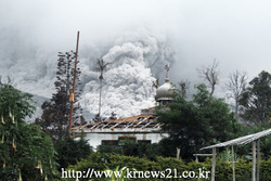 2014년 10월 28일, 인도네시아 수마트라 섬의 카로 지구에 있는 수카 메리아(Suka Meriah)마을에서 시나붕 화산 폭발로 내려온 거대한 재 구름으로 뒤덮인 손상되고 버려진 이슬람사원의 모습.