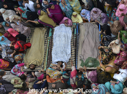 2014년 11월 3일, 이 전날에 발생한 국경지역 와가(Wagah)에서의 자살폭탄테러의 희생자들 주변에 파키스탄인 조문객들이 모여있다.
