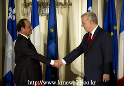 프랑수와 올랑드 프랑스 대통령(왼쪽)과 캐나다 퀘벡 주 필리프 쿠이야드 총리(오른쪽)가 2014년 11월 3일 만나 악수를 하고 있다.