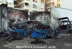 2014년 11월 13일, 리비아 수도 트리폴리에 있는 이집트 대사관 인근에서 차량 폭발로 인해 부숴진 차량이 보인다.