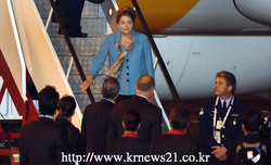 지우마 호세프(Dilma Rousseff) 브라질 대통령이 2014년 11월 13일, G20 정상회담이 열리는 호주 브리즈번에 도착해 고위관료들의 환영을 받고 있다.