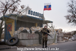 2014년 11월 16일, 총을 찬 친 러시아반군이 우크라이나 도네츠크 동부의 Kharzisk에서 러시아 깃발이 걸린 검문소에서 경비를 서고 있다.