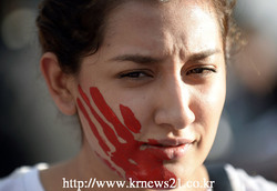 2014년 11월 16일, 멕시코시티에서 한 여성이 43명의 실종학생들의 무사귀환을 요구하는 시위에 참여하고 있다.