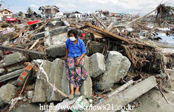 인도네시아 수마트라의 아체지역 여성이 반다 아체에서 폐허가 된 집터에 서 있는 2005년 1월 11일 사진. 지난 2004년 지진과 쓰나미로 인한 인도네시아 사망자수는 105,262명으로 실종자 명단에 포함되어 있는 인원은 10,046명이라고 사회부 관계자가 전했다.