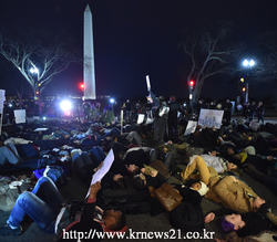 2014년 12월 4일, 시위자들이 워싱턴DC 거리에서 뉴욕에서 흑인 에릭 가너(43)를 숨지게 한 백인 경관 대니얼 판달레오(29)를 기소하지 않겠다는 대배심의 결정에 항의하며 시위를 벌이고 있다.