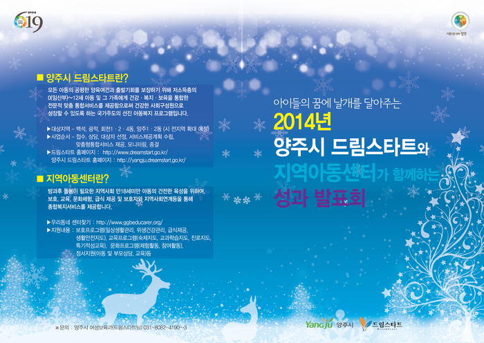 양주시는 오는 22일 오후 7시 경기섬유종합지원센터에서 ‘2014년 양주시 드림스타트․지역아동센터 성과발표회’를 개최한다고 밝혔다.