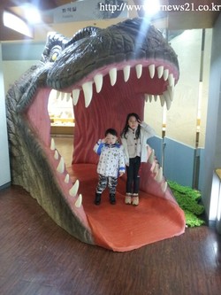 익산 보석박물관이 화석전시관 통로에 ‘타르보사우르스 공룡 조형물’을 설치해 방문객들에게 추억과 즐거움을 선사하고 있다.