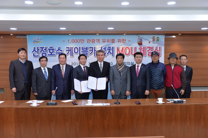 포천시에서는 수도권의 대표적 관광지인 산정호수를 명품 관광지로 조성하고자 30일 시정회의실에서 이기택 부시장과 정종근 시의회 의장, ㈜나라씨앤디 정재경 대표와 관계자들이 참석한 가운데 230억원 규모의 산정호수 케이블카 설치에 대한 투자양해각서(MOU)를 체결했다
