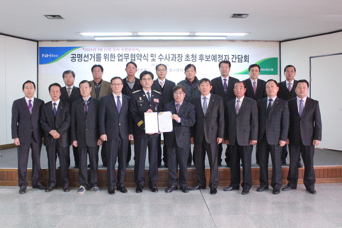 이날 협약식에는 정수상 고양경찰서장, 김승호 농협 고양시지부장, 농협조합장 출마예정자인 이某(56세)씨 등 12명과 선거관계자 등 30여명이 참석하였다.