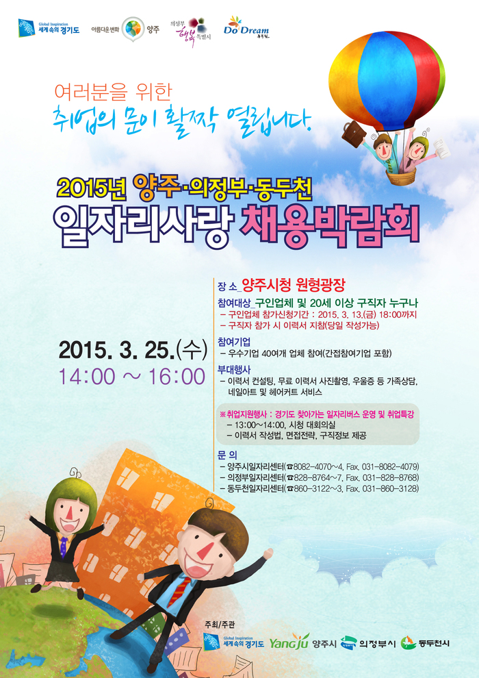 양주시는 오는 25일 시청 원형광장에서 개최될 ‘2015년 양주·의정부․동두천 일자리사랑 채용박람회’에 참가할 기업체를 모집한다.