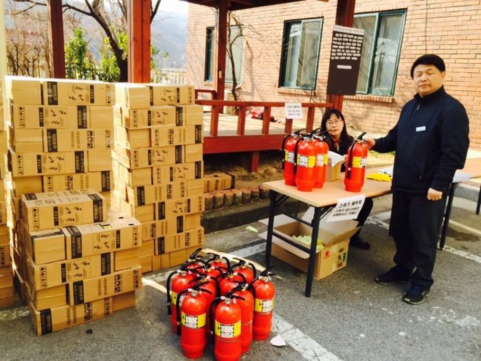 이날 우남송추마을아파트 입주자대표회의(회장 이영희)는 각 세대에 있는 14년 된 소화기를 회수하고 새로 구입한 소화기를 나눠주는 행사를 하였다.